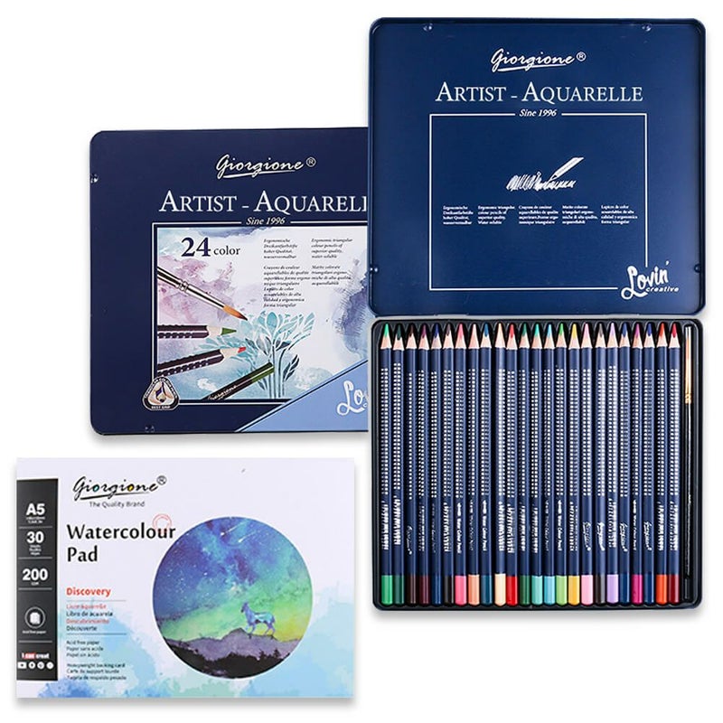 色鉛筆&水彩の両方が楽しめる水彩色鉛筆 24本セット 水彩ペン&水彩専用紙付き
