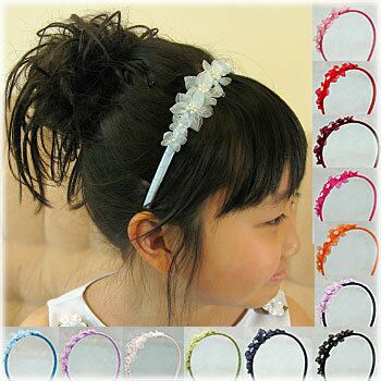 パールビーズとオーガンジーのお花がかわいい、選べる13色のカラフルなカチューシャ♪
