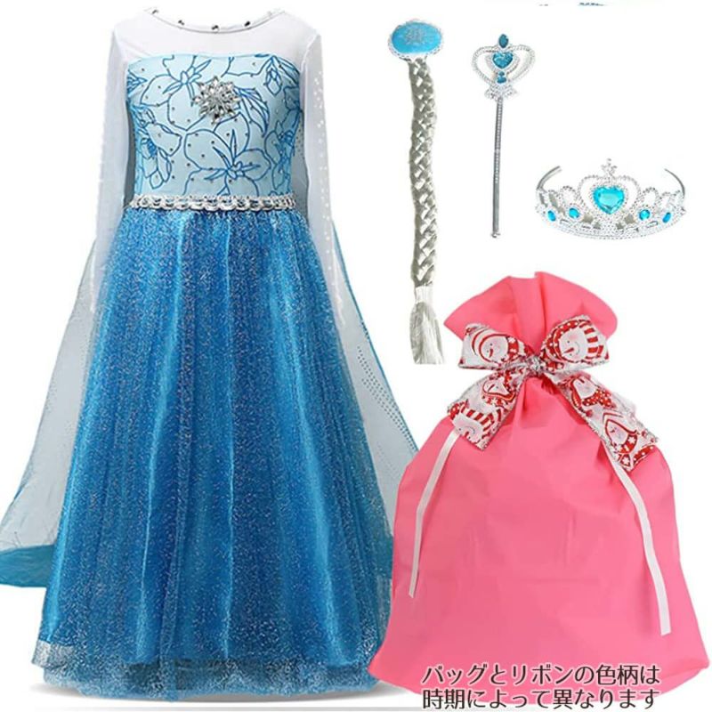 プリンセスドレスセット(エルサ風)(ドレス・三つ編み・ティアラ・魔法の杖)ギフトラッピング付【ハロウィン コスチューム】