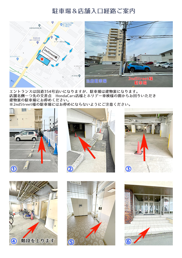 ![]() | ■駐車位置のご案内 建物裏手の駐車場にて、建物に向かって右手8台分の駐車スペースが当店の駐車場となります。 駐車場から店舗へは 建物地下駐車場を通ってエントランス側にお回りください。 どうぞお足元にお気をつけてご来店くださいませ。 |